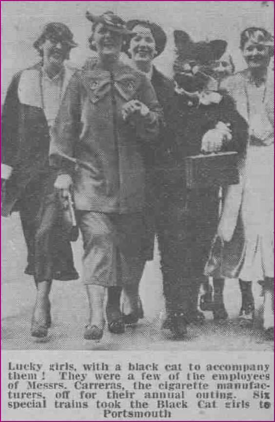 Sunday Mirror - Sunday 21st June 1936 - "Lucky girls with a black cat to accompany them! They were a few of the employees of Messrs. Carreras, the cigarette manufacturers, off for their annual outing. Six special trains took the Black Cat girls to Portsmouth" - image sourced from the British Newspaper Archive