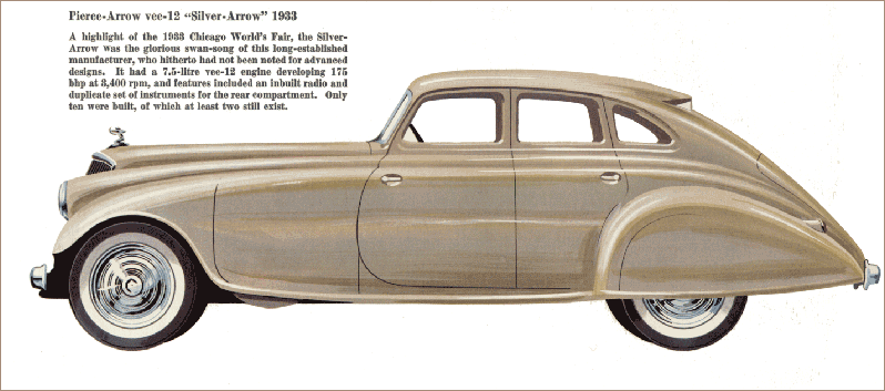 The Chicago   World’s Fair presented one of the most intriguing and   desirable pre-war cars, the 1933 Pierce-Arrow Silver Arrow   concept car, the ultimate example of Streamline Moderne. With a design   that was far ahead of its time, unexpectedly progressive for a brand   like Pierce Arrow and introduced a year before other streamlined cars   like the Chrysler Airflow and Tatra T77, it was   the talk of the town. Sotheby’s describes it “the car   that inaugurated the streamlined automotive age.” With its sleek design   with integrated fenders, its innovative technique and its powerful V12   engine, it surpassed in attention other automobile masterpieces that   were also introduced during the World’s Fair, like the one-off   Duesenberg Model SJ Torpedo Sedan, Packard’s advanced V-12-powered Sport   Sedan and Cadillac’s Aero-Dynamic Coupe with 16 cylinders.