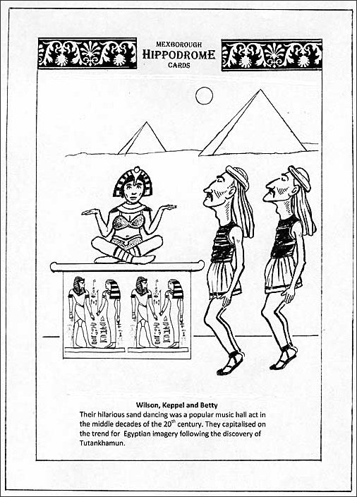 From the Victoria and Albert Museum web-site : 'Wilson, Keppel and Betty formed the greatest eccentric dance act of all time. Wilson and Keppel were two doleful, gangling, moustachioed, skinny-legged and obviously English men. They wore parodies of Eastern dress, usually a fez and a short nightshirt, revealing their scrawny legs. The third member of the team was the glamorous Betty. To the popular music ‘Egyptian Ballet’ by Luigini, they performed a sand dance based on poses familiar from Egyptian tomb art, with Betty as the central seductress. Their complete seriousness added to the hilarity. The dance only became funnier as Wilson and Keppel got older and more emaciated. Music hall spawned many comedy dance acts but no other has become part of the general public consciousness like Wilson, Keppel and Betty. A comedian or performer only has to turn in profile and raise a hand in ‘Egyptian’ style for audiences to know the reference. They even turn up (or their costumes do) as Gulli, Gulli and Betti in Terry Pratchett’s Jingo – once the fez and nightshirt were out of the bag, no reader needed the parodied name to get the reference.'