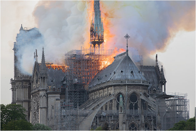 The steeple and spire collapses as smoke and flames engulf the Notre-Dame Cathedral in Paris on April 15, 2019. - A huge fire swept through the roof of the famed Notre-Dame Cathedral in central Paris on April 15, 2019, sending flames and huge clouds of grey smoke billowing into the sky. The flames and smoke plumed from the spire and roof of the gothic cathedral, visited by millions of people a year. A spokesman for the cathedral told AFP that the wooden structure supporting the roof was being gutted by the blaze. (Photo by Geoffroy VAN DER HASSELT /AFP) (Photo credit should read GEOFFROY VAN DER HASSELT/AFP/Getty Images) - Image sourced from and © of Getty via Wordpress