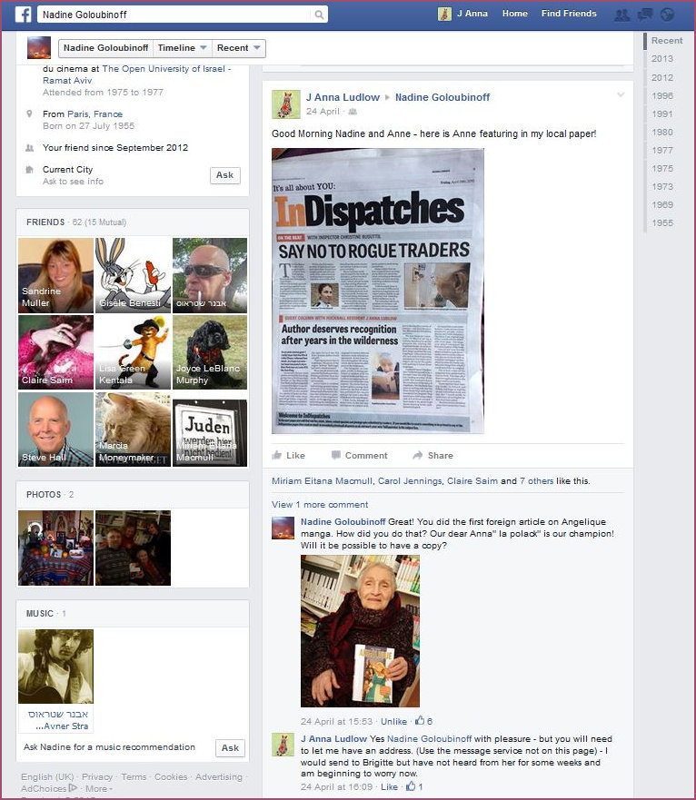 Anne Golon enjoying the first episode of the Angélique 'Manga' based on her work - image provided by Nadine Golubinoff as it appeared on the artist Dara's Fb page