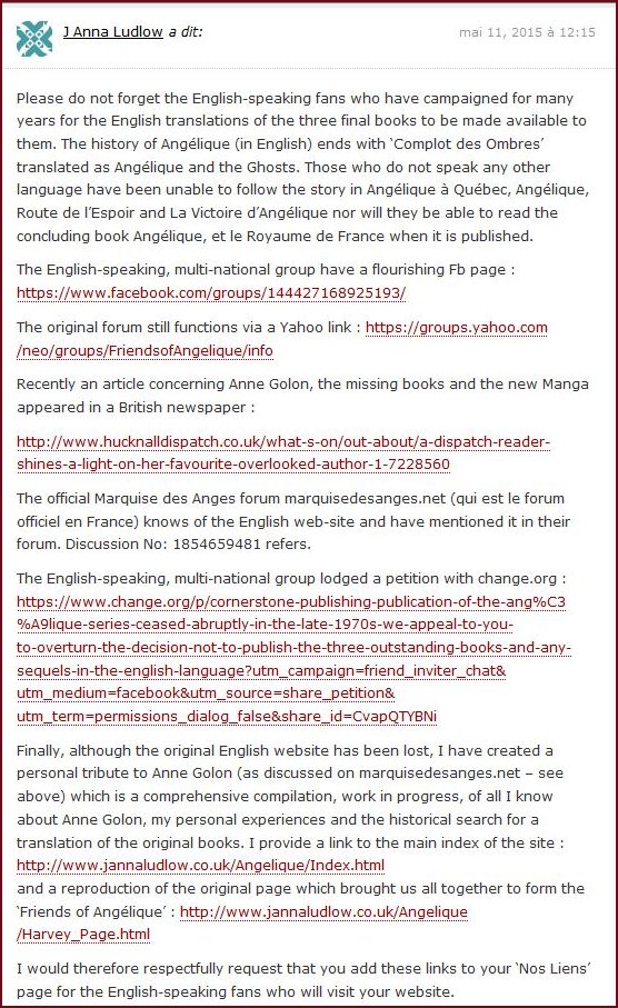 "Merci à Anne Golon et sa fille Nadia, pour leur extrême gentillesse et leur disponibilité, merci aussi à tous les fans présents, ainsi qu’à tous ceux qui ont envoyé des petits mots de sympathie, et un grand bravo à Yaëlle pour son organisation sans faille !"