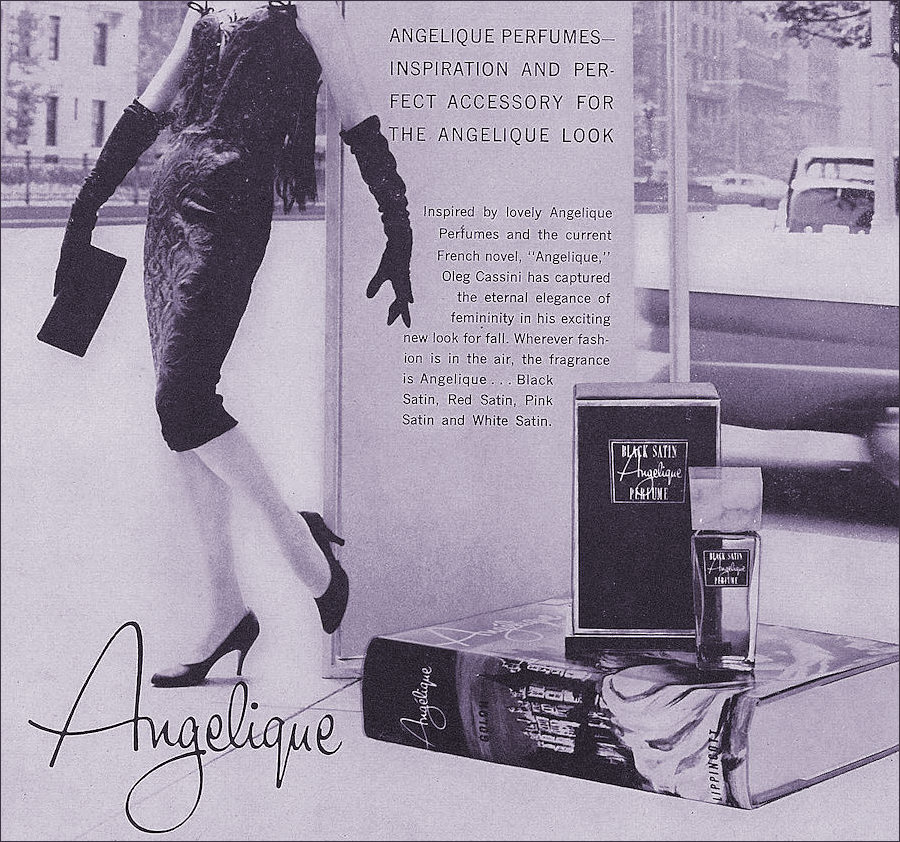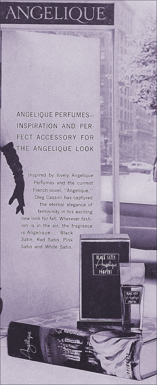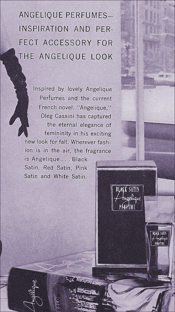 Inspired by lovely Angélique Perfumes and the current French novel "Angélique," Oleg Cassini has captured the eternal elegance of femininity in his exciting new look for fall. Wherever fashion is in the air the fragrance is Angélique ... Black Satin, Red Satin, Pink Satin and White Satin' - Sourced from Vogue Issue 1st October 1958