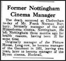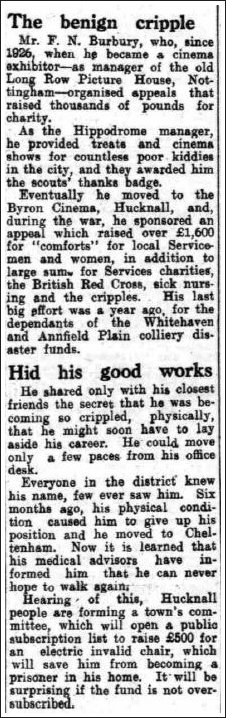 The Nottingham Evening Post dated Saturday, July 31st 1948 reports how the people of Hucknall rallied around to help former Byron Cinema Manager, Mr F N Bur bury when he was told that he would never walk again.