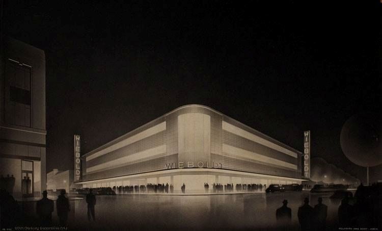 A 'mixed media on board' department store design by Holabird and Root Architects for the Wieboldt Building in Oak Park, Illinois - the design is dated 'circa 1936'