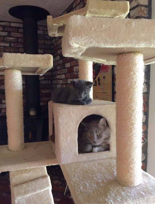 Rascal (top) with Daniel sharing a magnificent cat 'tree' - July 2016