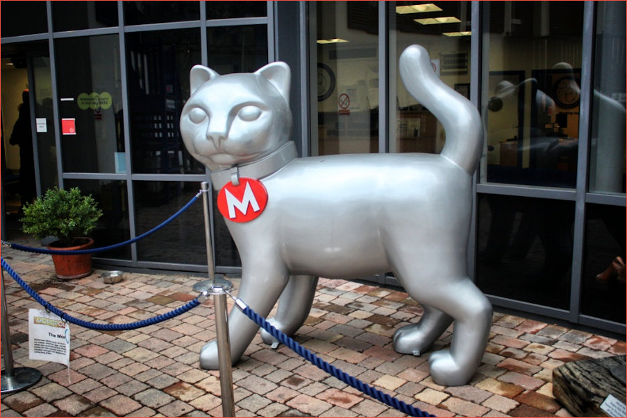 "Battersea cats come in all shapes and sizes but in 130 years of caring for cats and kittens, this is the first time we have taken in a 6ft tall, fibreglass feline. Meet the Monopoly cat, given to us by board game maker Hasbro to mark a change on the Monopoly board which saw the iron token replaced by a cat. Now proudly standing guard outside Reception at our London centre the mammoth moggy is available for all our visitors to see." - Information Source : Battersea Cats & Dogs Home - Image Source : thedailyconstitutional.co.uk
