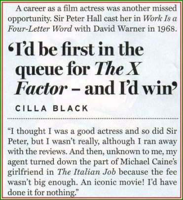 Cilla Black would have liked to have played the girlfriend in 'The Italian Job' but her agent turned it down!