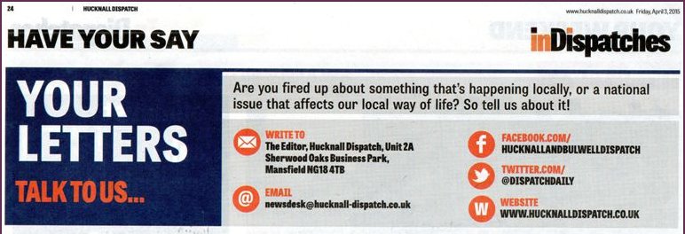 I know, I know, I'm becoming the resident Hucknall eccentric! Guess what - they printed my letter on Good Friday (3rd April 2015)!