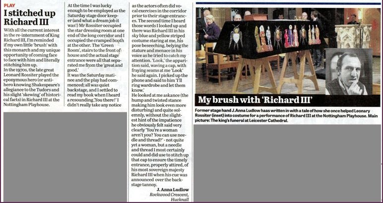 He looked at me askance (the hump and twisted stance making him look even more disturbing) and quite solemnly, without the slightest hint of the impatience he obviously felt said very clearly 'You're a woman aren't you? You can use needle and thread?' - not quite yet a woman, but a needle and thread I most certainly could and did use to stitch up that cap to ensure the timely entrance, properly attired, of his most sovereign majesty Richard III when his cue was announced over the backstage tannoy.