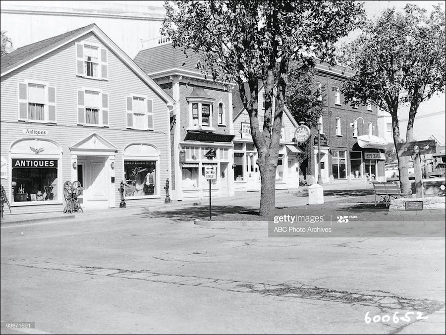 A fantastic clear view of the 'shop-side' of the Green clearly following my original map (above) - Image sourced from and © of Getty/Walt Disney - Image Provenance : PEYTON PLACE UNITED STATES - NOVEMBER 08: PEYTON PLACE - "Set Shots" Set (Photo by Walt Disney Television via Getty Images Photo Archives/Walt Disney Television via Getty Images)