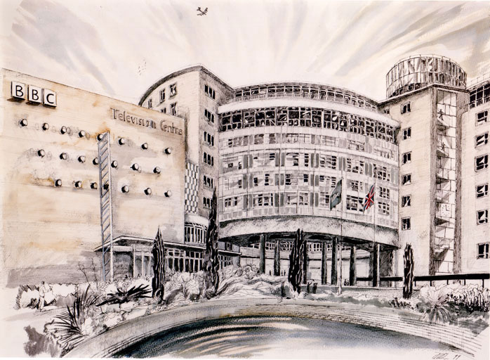 “Designed by Graham Dawbarn and built in 1960, it lies four miles outside central London at Shepherds Bush. A distinctive circular main block – affectionately known in-house as the ‘doughnut’ – houses technical areas and equipment, together with facilities for artists and administrative offices. “Grouped around it are studios, linked by a covered walkway to a scenery block to allow swift movement of scenery. The sculpture in the central garden of the building shows Helios, the Greek god of the sun. Designed by T. B. Huxley-Jones, and erected in 1960, it represents the radiation of television light around the world. The two reclining figures at the bottom are Sound and Vision, the two components of television.” – The BBC state.