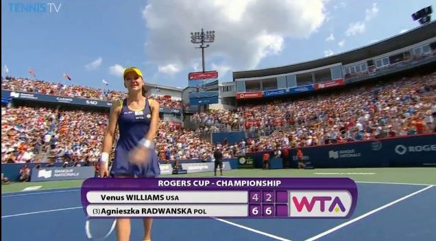 Broken in the first game, Venus was immediately on the back foot. Radwańska easily outplayed her to break again, and the first set was over, 6-2 in 28 minutes. Early in the second it looked as if the match would be over in 40 minutes, with Radwańska quickly racking up two breaks. The Pole was scampering enthusiastically about the court, reaching this and retrieving that, whereas Venus was listless, possibly affected by Sjogren’s Syndrome, a disease that has periodically left her drained of energy since she was diagnosed at the last US Open. But at 0-4 a break point came her way and she punched home a backhand volley as of old. Minutes later she had three break points for 3-5 and got there when Radwańska dumped the ball in the net.