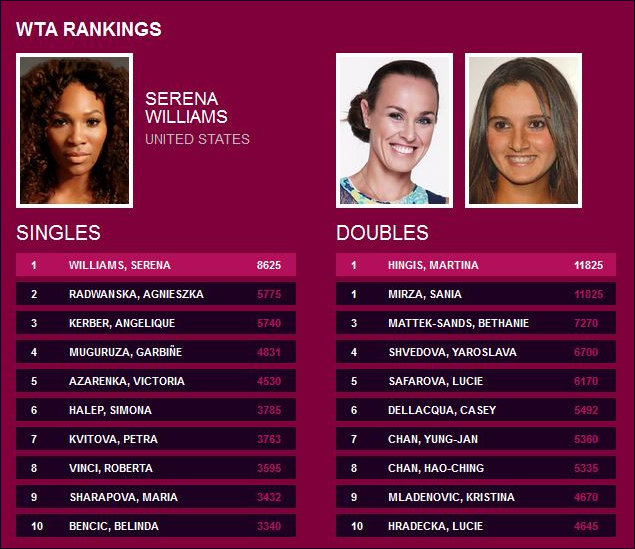 The WTA Rankings announced on 11th April 2016